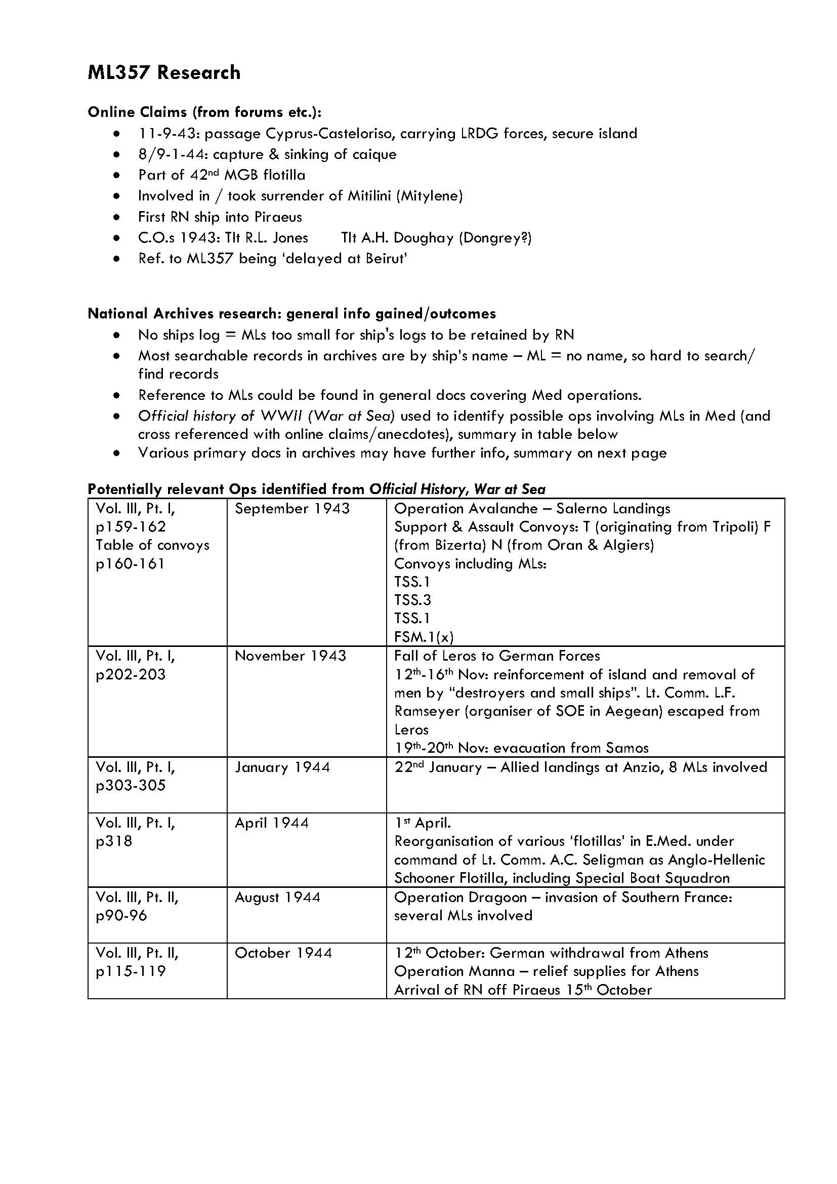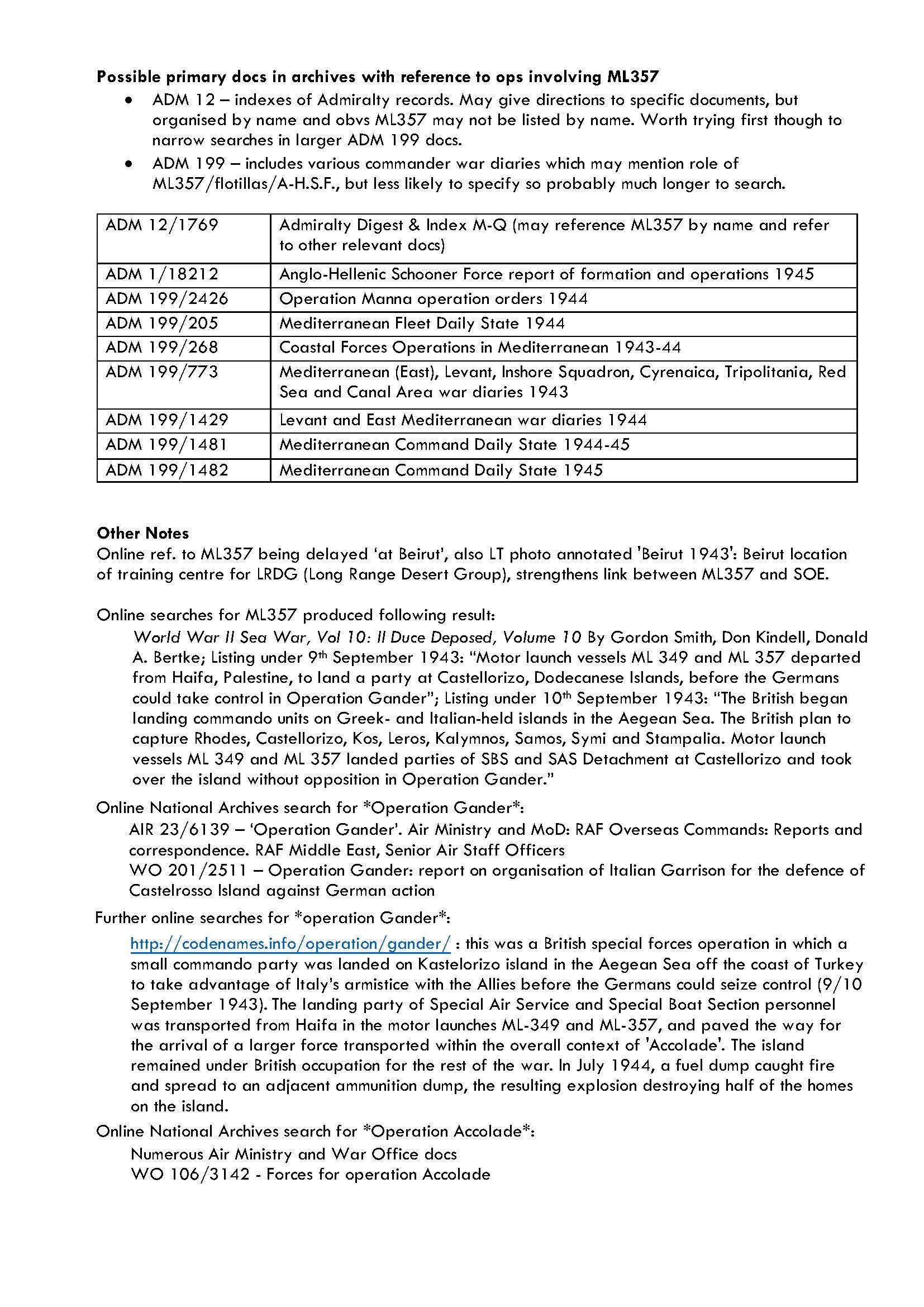 For anyone interested, these are notes I made summarising where I was on research on ML357 a couple of years ago, so I (or my dad) could pick it up when we had more time. I spent a day at the National Archives in Kew looking for various things but including spending a fair amount of time on stuff relating to ML357, but haven’t had any time yet to return to it. Hope it may be of use or interest to others: