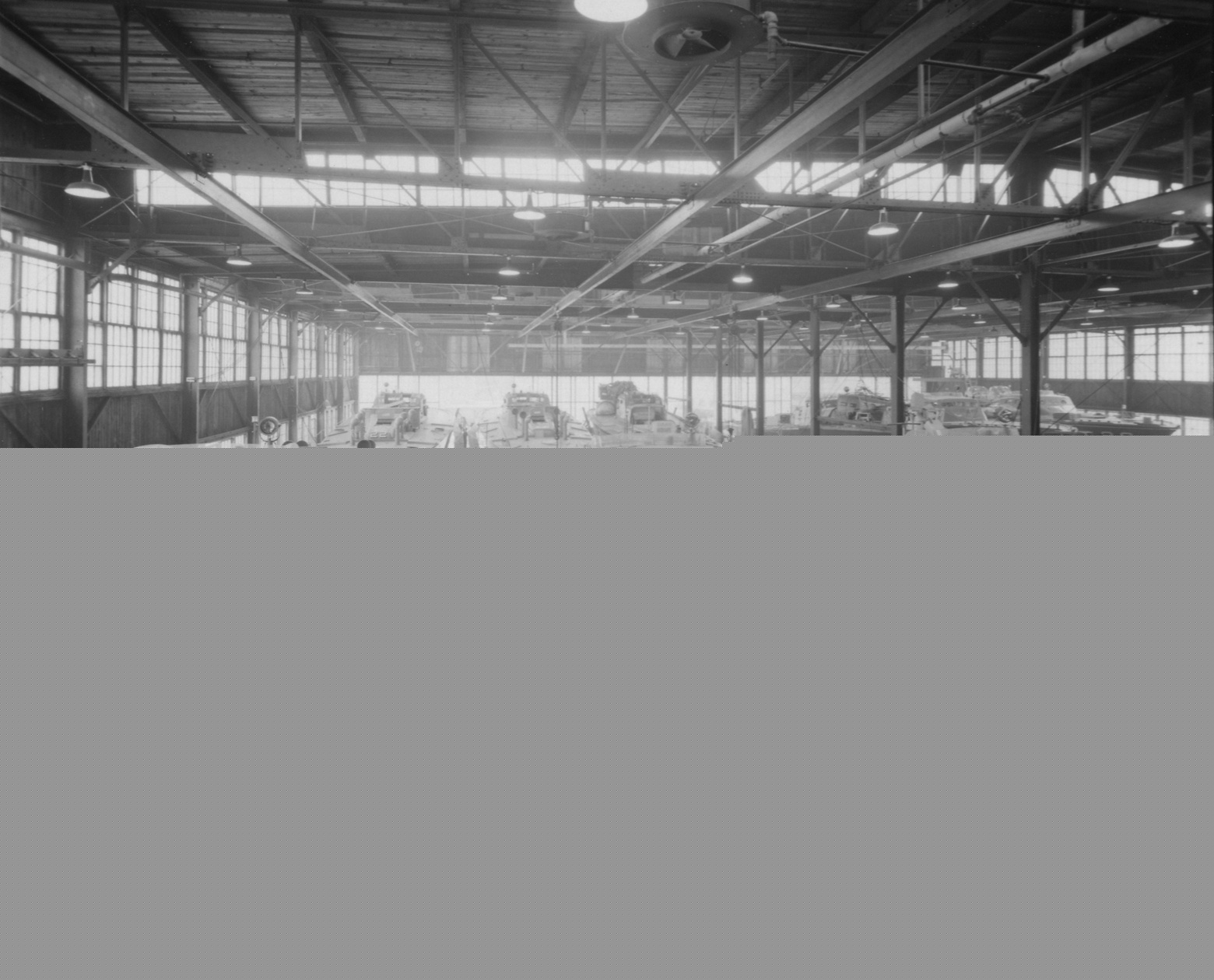 This photograph shows 77 and 70-foot boats on the same assembly line. PT 23 is in the left foreground, while PT 19 is to the immediate right. In the background, far left, can be seen PT 22, while PT 26 is at the far right; other 70-foot boats can be seen in the background as well. It appears the 70-footers are being gutted for modification prior to their transfer to Royal Navy hands--note the exhaust pipes and other equipment on PT 19's foredeck.