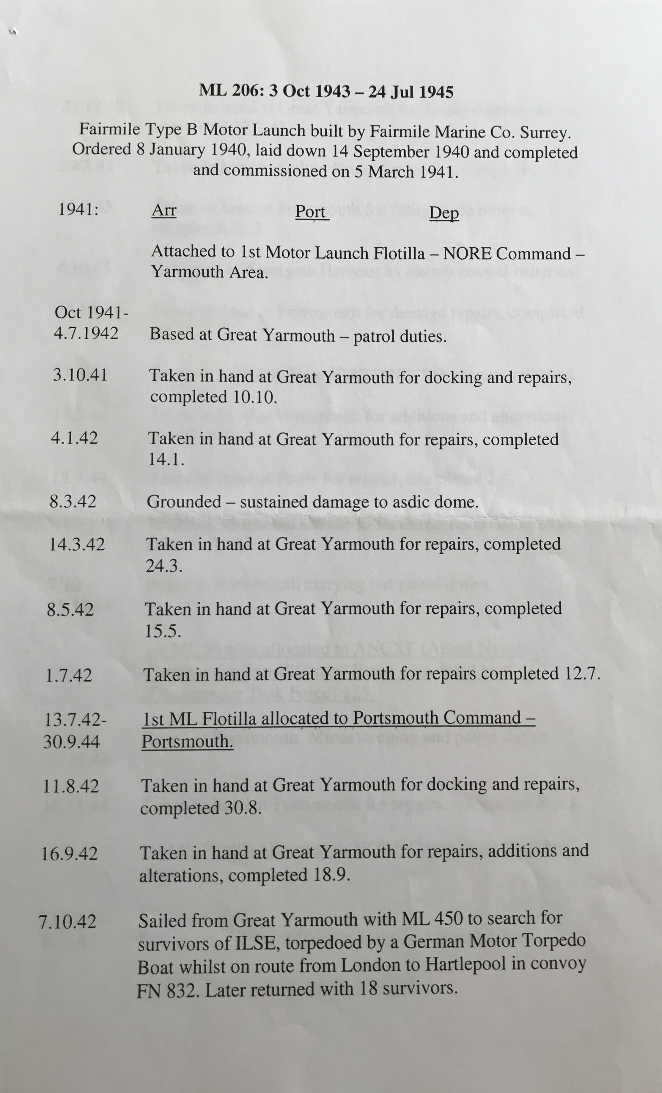 Could you tell me how you obtained the information? I am wondering if similar deployment details exist for ML 207. My own searches have not uncovered anything. However, I have unearthed information that explains why ML 206 was being repaired in the October of 1943, after being damaged by a shell in Ramsgate Harbour. I discovered a document at the National Archives that relates to the incident, which I have included below - ML206 is mentioned top left.