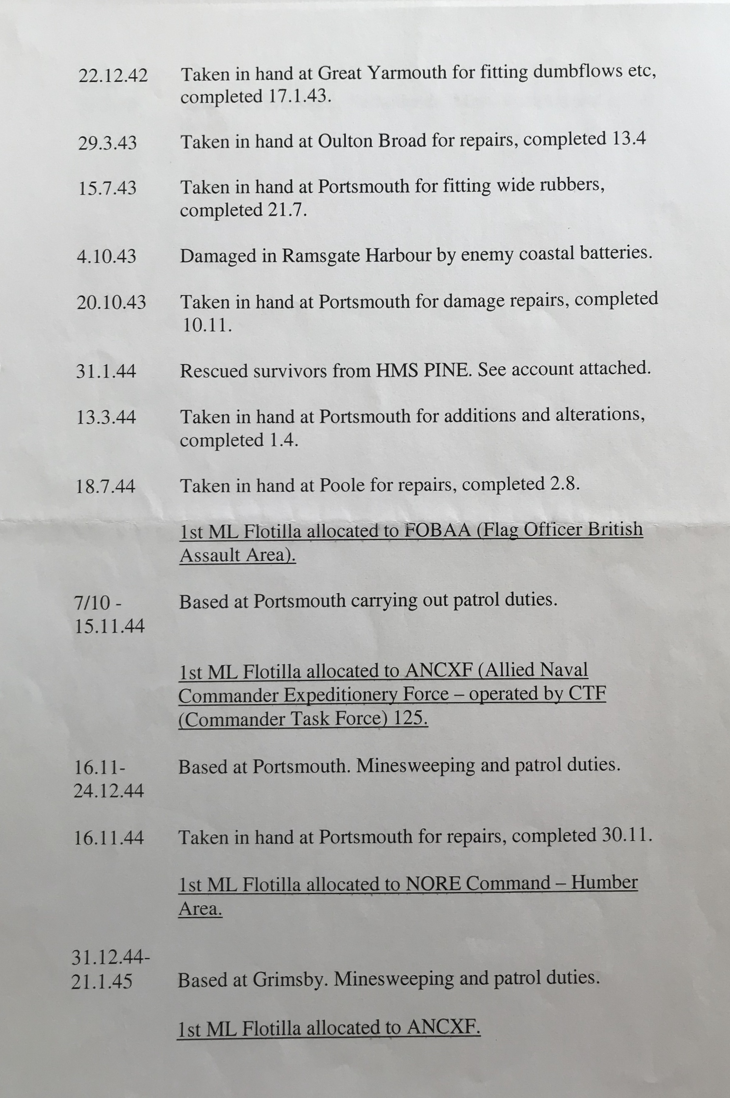 Individual ships from the flotilla would, of course, have been in for repair or refit at different times, so were not always together, which complicates matters. However, the flotilla deployment contained within your time line is particularly useful. I had been under the impression that the flotilla had been based in Ostend not Terneuzen but I suppose it spent considerable time at both ports during mine sweeping operations. Just as it spent roughly equal times at Gosport and Ramsgate, when on convoy escort duty in the Channel, even though the flotilla was actually based in Gosport.