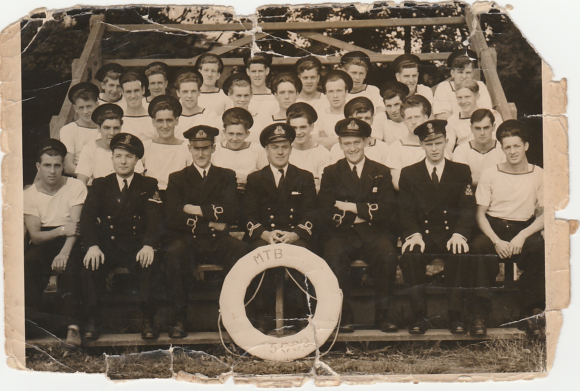 His name is Robert (Bob) Peel and he was 17 and a bit when he was called-up and had his eighteenth birthday in March 1945. In the joint crew photo, he is just behind the B of MTB on the lifebuoy, so that's fourth from right on that second row of nine. In the other photo of MTB 5009 only, he is again fourth from right on the second row from the front, just behind the lieutenant.