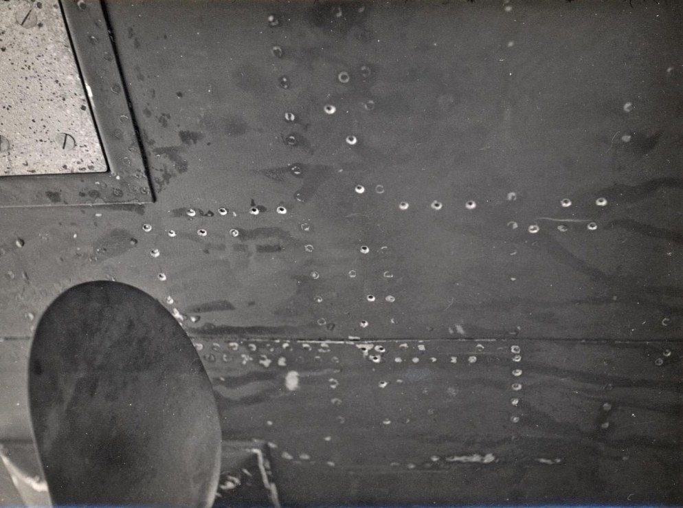 It was found that many rivets had been lost from the hull plating around the ROTOL prop area from vibration and cavitation. This problem continued to dog the boat until heavier 1/8" plating and larger rivets were fitted in place of the original 1/10" plating.