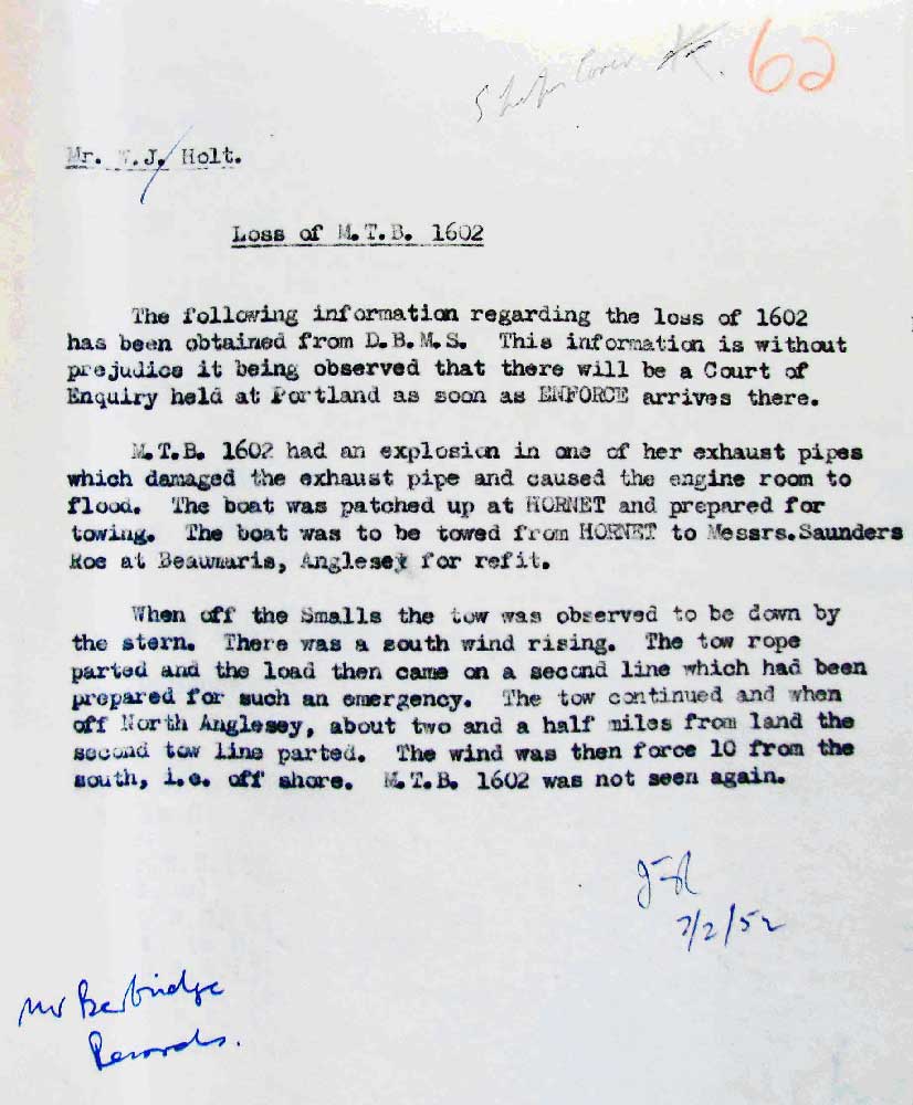 While reading through CFA Green's memoirs aboard P1602 he refered to a film made in 1951 that shows a 'brief' glimps of P1602 in action. She appears for only 2 or 3 second at a time, but does show her charging through the sea and even shows up small impact damage near her Port bow!