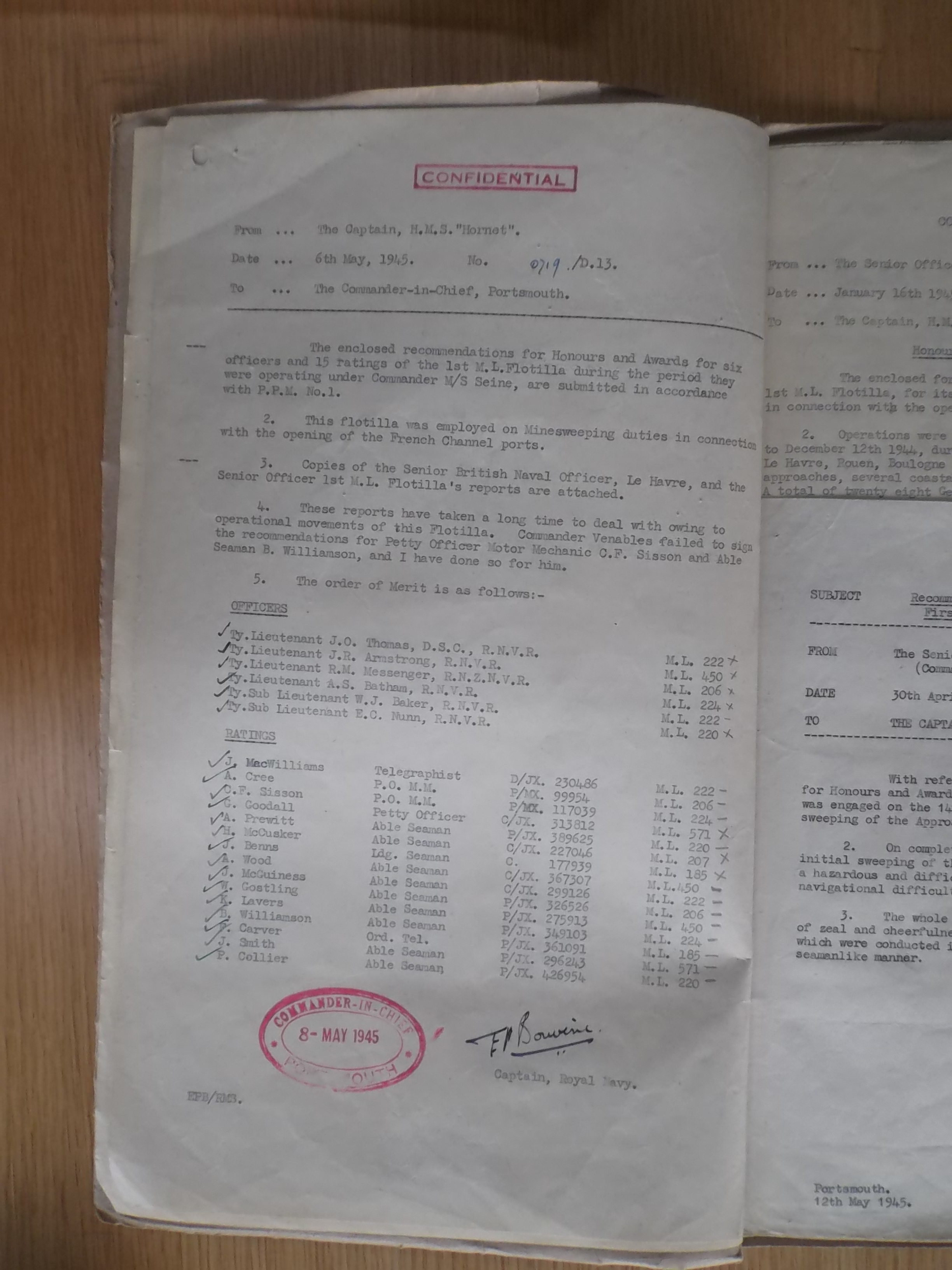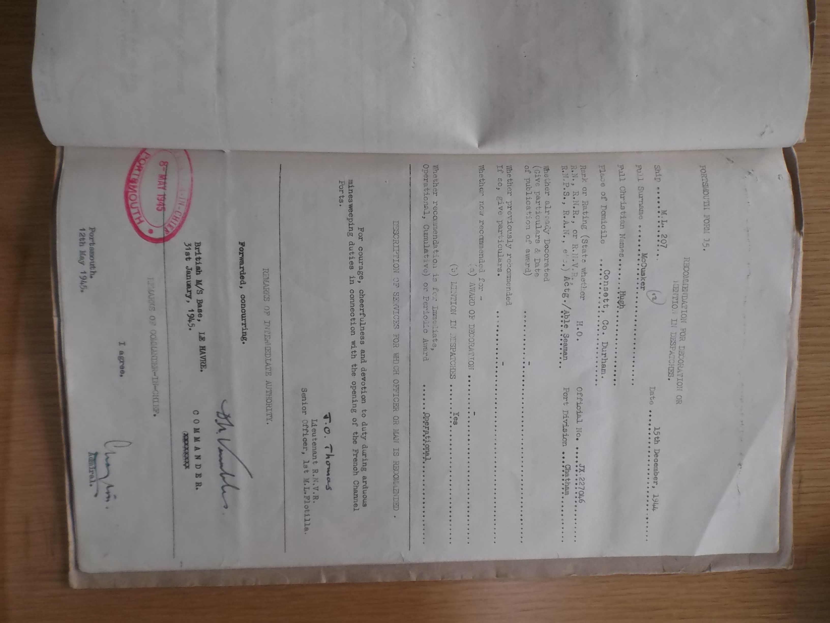 Steve, thank you, for your post showing the citation for Hugh McCusker and others. The fact that McCusker is listed in the citation as a crew member of ML 207 does tend to support my father’s writings, which indicate that McCusker was a member of ML 207’s crew during operation Neptune and during the mine clearing operations of the Channel Ports that took place following D-Day. As I explained in a previous post, Had Hugh transferred from ML207 to ML 571 prior to D-Day, it seems strange that my father would have remembered him so well. It is interesting to note the date of the citation, 15th of December 1945. I take it that this indicates that Hugh McCusker was still aboard ML207 at that date.