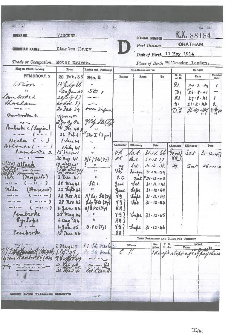 TLt Charles Donald Chaffey RCNVR Ord HMCS Discovery (RCN base & reserve depot, Vancouver, BC) 10/40 HMS Raleigh 11/40 HMS Pytchley (destroyer) HMS King Alfred 12/40 TASLt 31/12/40 HMS St Christopher for MLs 5/9/41 ML 209 15th ML Flotilla Based at Scapa Flow First Lieutenant MTB 232 2/4/42 TLt 31/12/42 10th MTB Flotilla MTB 309 Commanding Officer MTB 232 Commanding Officer MGB 212 6/5/43 HMS Attack (Portland) for small craft 26/5/43 29th MTB Flotilla Based on Portsmouth Commanding Officer MTB 465 27/3/44 – 9/2/45 Further awards for Operation Neptune MID 29th MTB Flotilla Commanding Officer MTB 486 25/2/45 – 3/3/45 Born in 1918 and died in 1989