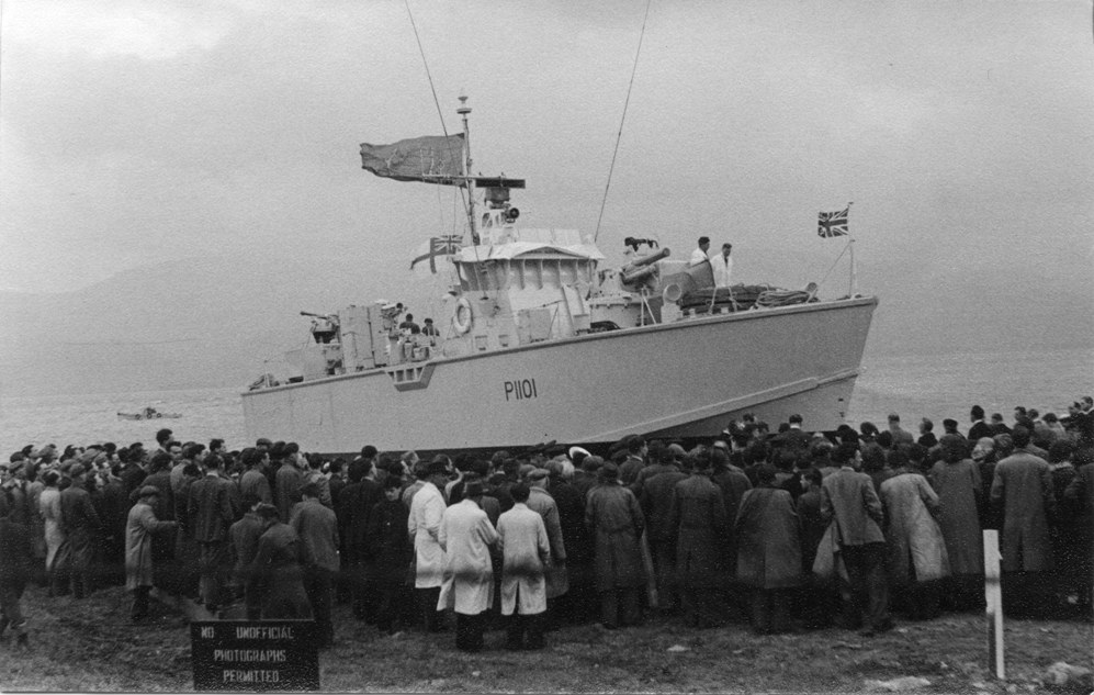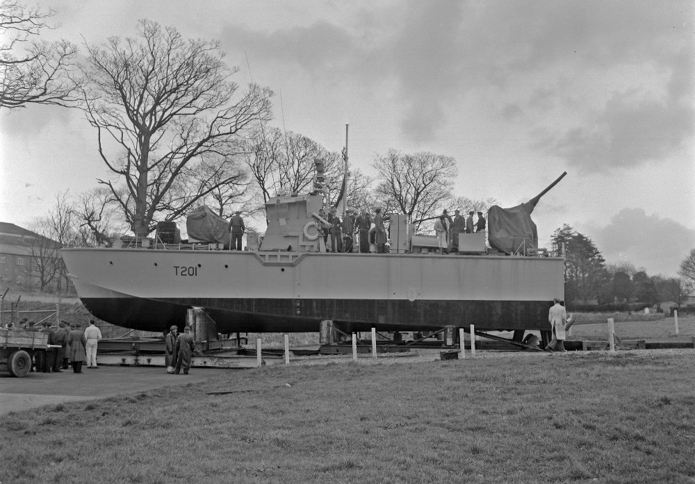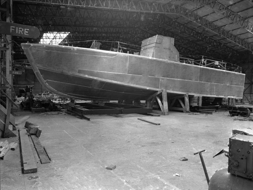 The Royal Navy’s ‘Dark’ class had quite a long gestation period having been ordered in the mid to late 1940s. The rather severe box like design had had its origins on the drawing boards of the Royal Naval Constructors at Bath (UK) however, Messrs Saunders Roe were awarded the detail design contract for what was then known as the Admiralty Type ‘A’ Fast Patrol Boat. The specification required that it should be diesel powered; the power units chosen were to be a marinised version of the powerful Napier ‘Deltic’ engine. Using a combination of alloy frames and decking, with traditional wood for hull sheathing, we are indebted to David Mills for this image of the final stages of construction of P1101 HMS Dark Adventurer – we hope to show you more from his collection of archive material from Messrs Saunders Roe. (click image for full view).