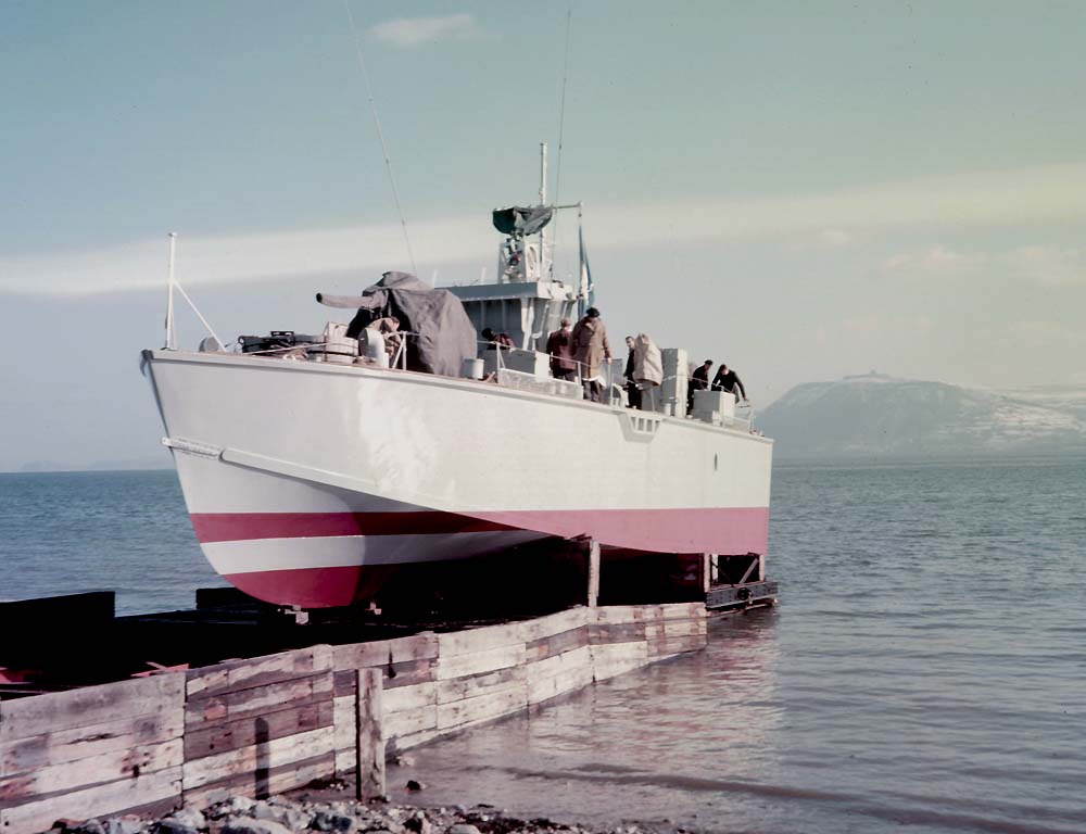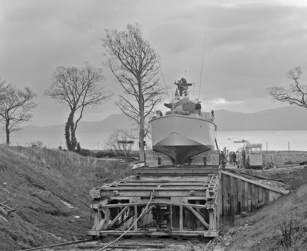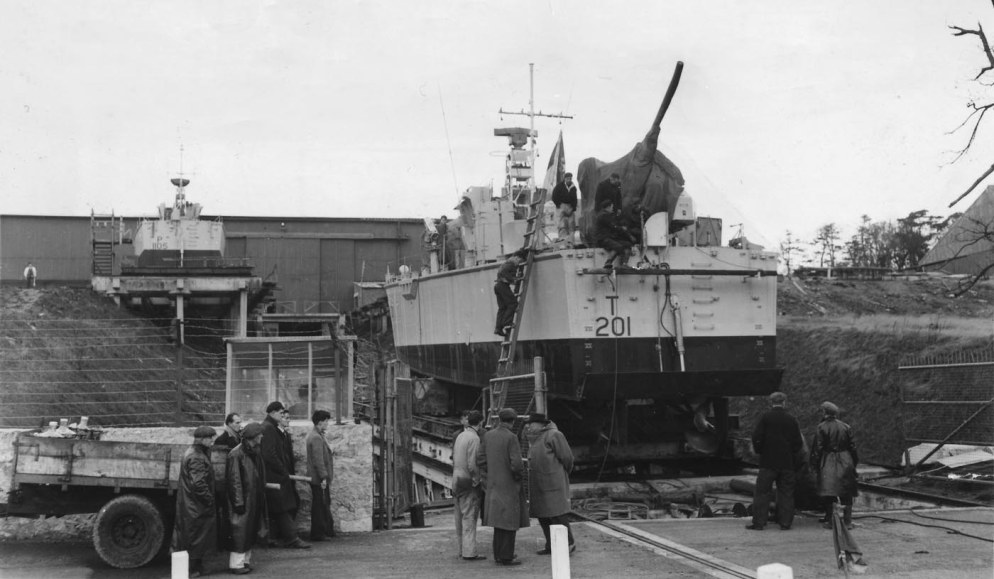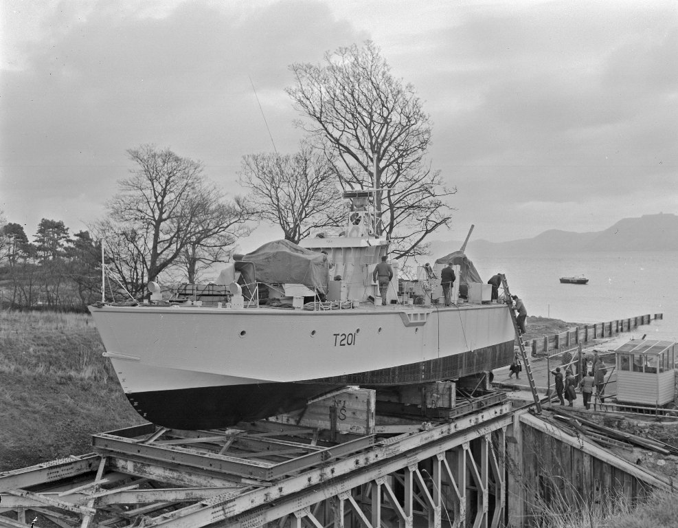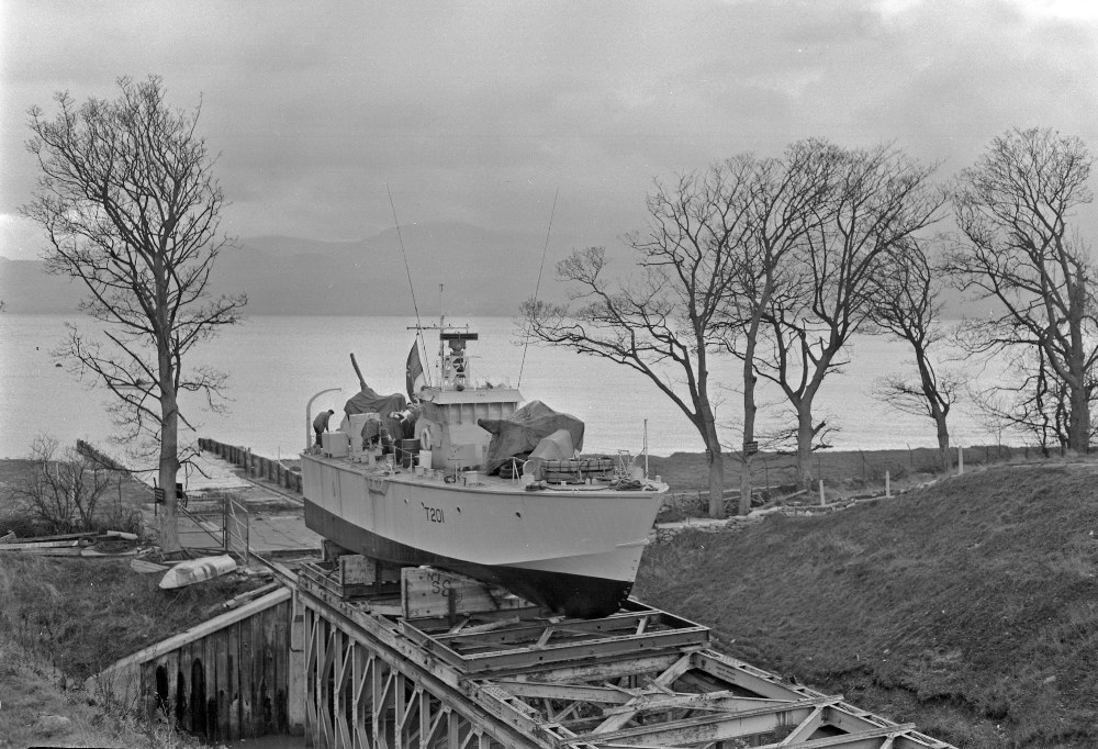 Another evocative couple of photos of the Burmese 'Dark' T201. One on the inclined slipway at Saunders-Roe Beaumaris. The slip way built in 1953 on the funicular system where the boat starting on the level at the top of the inclined rail tracks, but ending up at a small angle to help them roll across the coast road to Penmon. The other photo was taken by my father Victor Mills of me on the bridge of T201 before having a wonderful trip along the Menai Strait to Port Dinorwic.