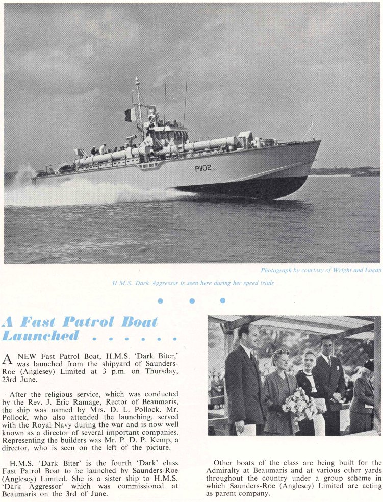 I will add photos of the Dark's starting with this general arrangement drawing of the Type A FPB (Fast Patrol Boat) They were designed to be like the Black & Decker drill by being able to add various attachments, like a pair of 20mm Oerlikons on the aft deck, torpedo tubes making them MTB’s, or a larger Cannon as seen on the pair for Finland, Vasama 1 and 2. Saunders-Roe (SARO) also built a series of five riveted aluminium hulled FPB's for the Burmese Government (T201-T205) and were fitted with a bespoke alternative electric drive in addition to the twin Deltics. These were known as Slow Speed Drives. My father said they were for enabling the Burmese Navy to creep silently along the many creeks to catch smugglers and bandits. It all sounded very exciting to hear such things when I was only a young lad at the time. All the RN Dark Class were of timber diagonal planking over an aluminium frame structure with the single exception of P1120 Dark Scout. This was a unique model with an all-welded aluminium hull, simplified bridge design (no spray deflectors) and the used transom exhausts. Photos of Dark Scout become easy to spot even at a distance with that 'box' of a bridge. She was also the last to be built at the Beaumaris works and was launched 20 March 1958.