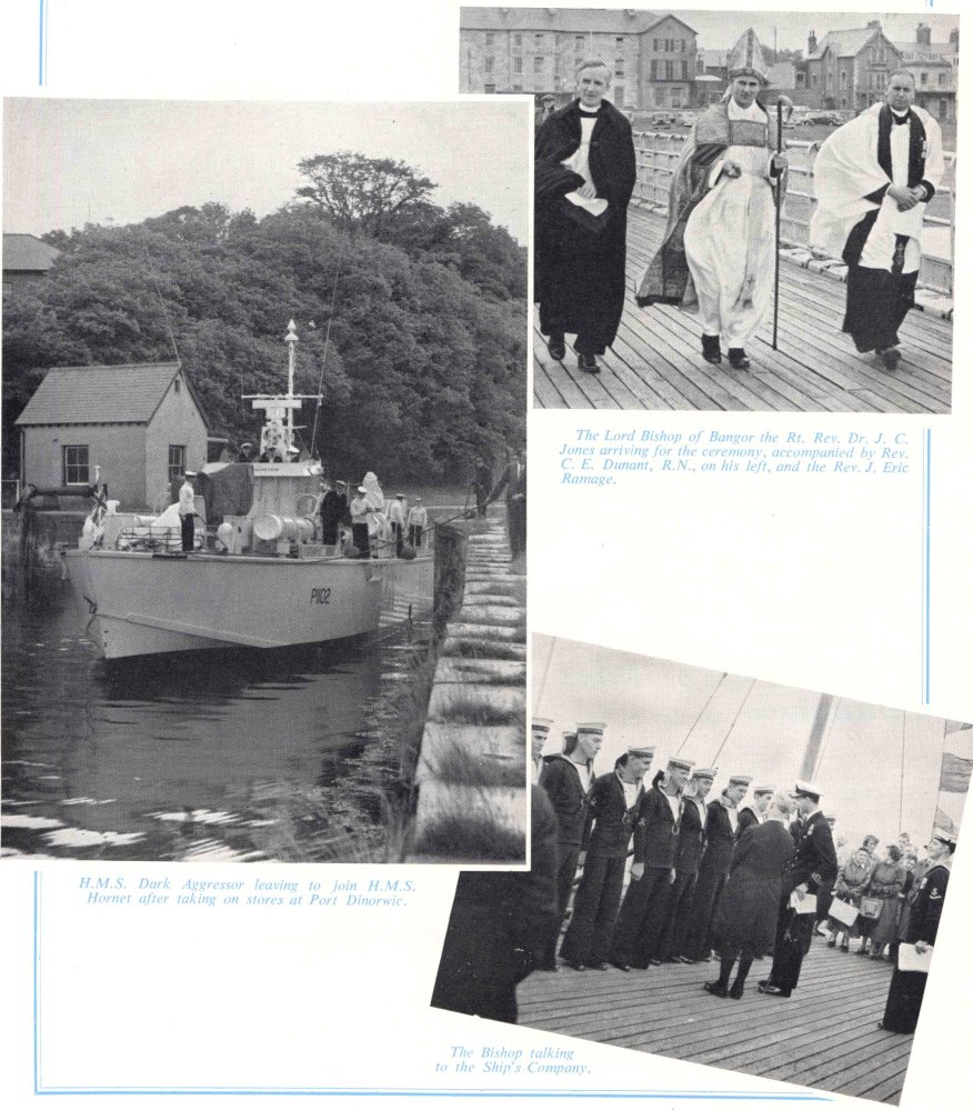 3 May 1957 during the naming ceremony with Christening bottles raised over bows. These were electrically released from a control desk on the pier head.