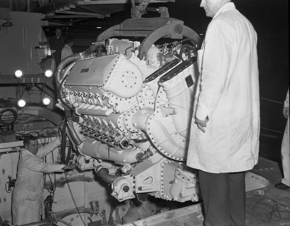 Section through Napier Deltic 18 cylinder supercharges two-stroke Diesel engine of 2,500 bhp