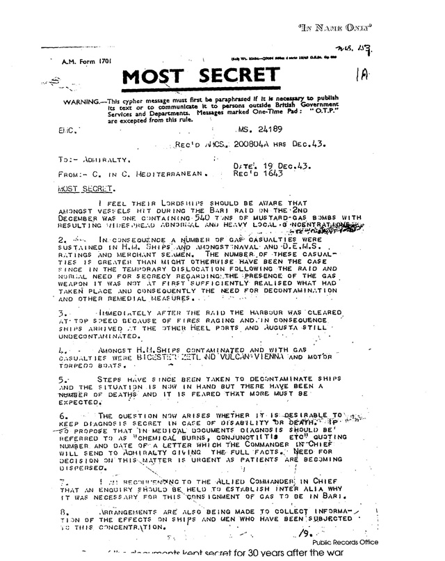 7. I am recommending to the Allied Commander in Chief that an enquiry should be held to establish inter alia why it was necessary for this consignment of gas to be in Bari.