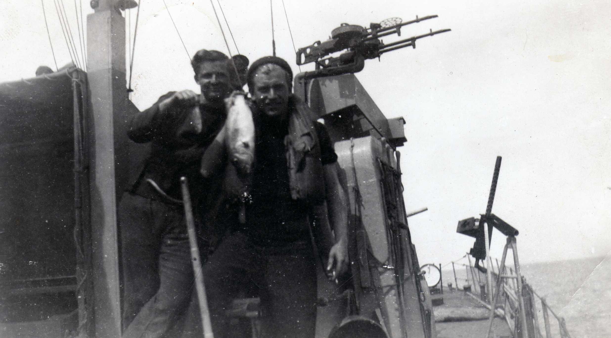 Bonafacio Straits - self and Hughie with fish brought to surface by exploding mine.jpg