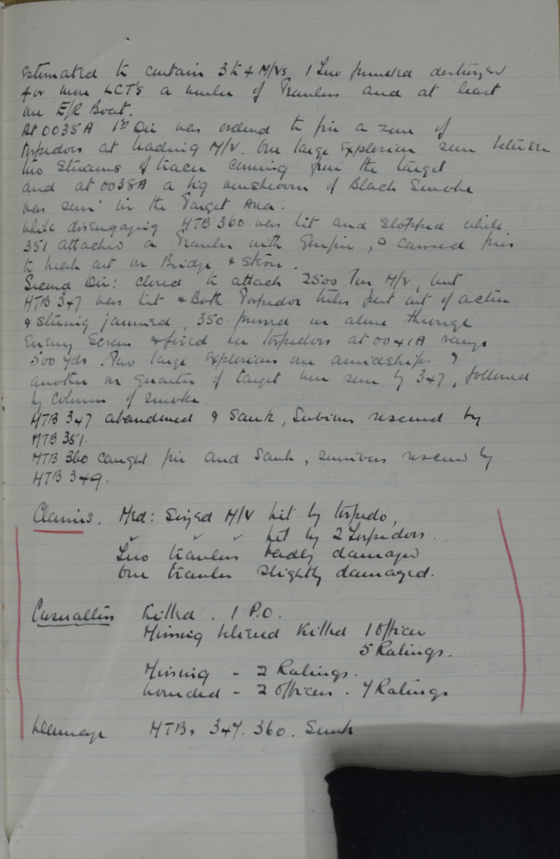 The Public Record Office at Kew has a series of Coastal Forces Log Books, which are handwritten notes documenting patrol details and any actions, on a daily basis. ADM 199/2416 contains a report of an action for the 9th December 1943 involving MTB 355 which could be the action for which Trelawney received the bar to his DSC, and your grandfather his DSM, as the timing is quite good for the notification of the award two months later in February 1944. I am including the relevant pages below. In addition I am also posting two pages from ADM 199/2417 covering the night of 30th September / 1st October 1944 which is the action your grandfather was killed in, which is noted on the page.